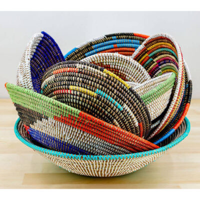 Handwoven African Tabletop Bowl – 4×12 Blue/White/Orange/Green/Black/Yellow Stripes