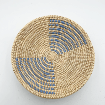 Handwoven African Tabletop Bowl 4×12 – Light Blue + Beige Half Stripes